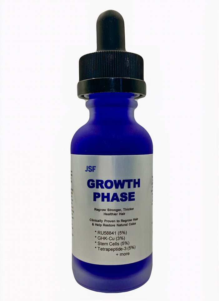 GROWTH PHASE uses the latest in cutting edge research combined with the highest quality ingredients to bring you the new powerhouse in hair regrowth and the most potent topical formula currently available. Formulated for maximum hair growth at the highest clinically recommended amounts for optimal results. "Harness the power of advanced peptides, stem cells and RU58841 to rejuvenate your hair. This formula is enriched with GHK-Cu copper peptide, Acetyl tetrapeptide-3, RU58841, Niacinamide, Biotin, Caffeine and organic extracts for healthy, vibrant hair."