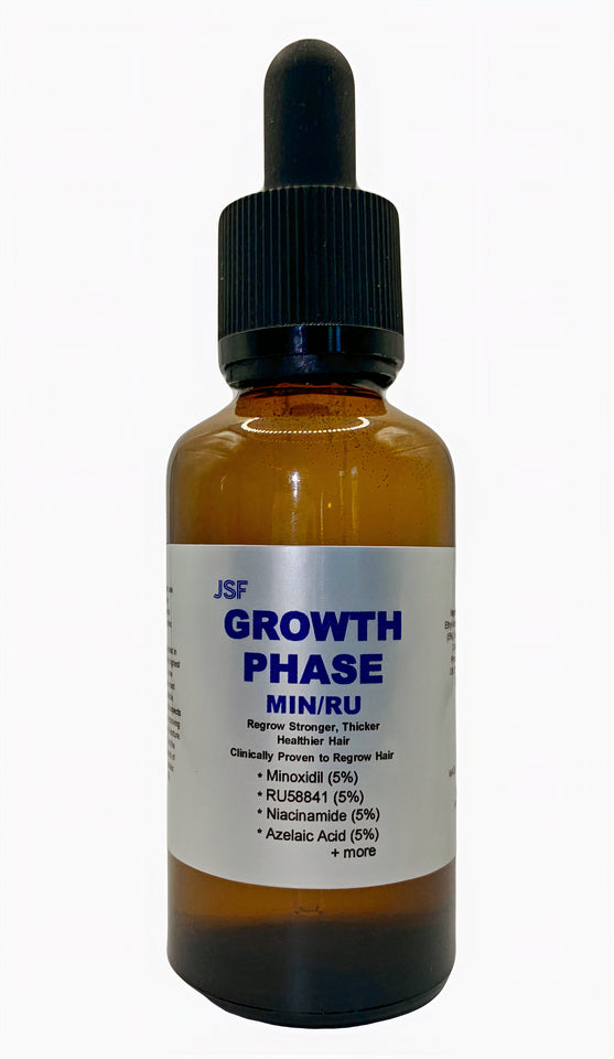 If you are a Minoxidil user that wants to take your hair regrowth, hair and scalp health to the next level this is for you! "GROWTH PHASE MIN/RU is a powerful blend designed to combat hair loss and promote regrowth. Our formula includes Minoxidil, RU58841, Azelaic acid, Niacinamide, Biotin, Caffeine and a mix of essential oils for maximum effectiveness."